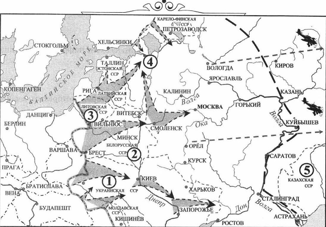 План «Барбаросса» (утверждён 18 декабря 1940) предусматривал разгром СССР в ходе молниеносной кампании («блицкриг») за 3–4 месяца. Три группы армий наносили удары по трём стратегическим направлениям: