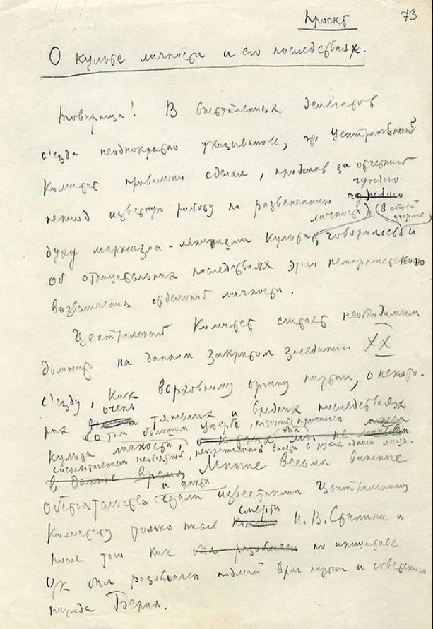 Крайне важным является вопрос о культе личности, о его постепенном росте, вопрос, который на определённом этапе стал источником целого ряда крайне серьёзных и тяжёлых извращений партийных принципов, партийной демократии, революционной законности.