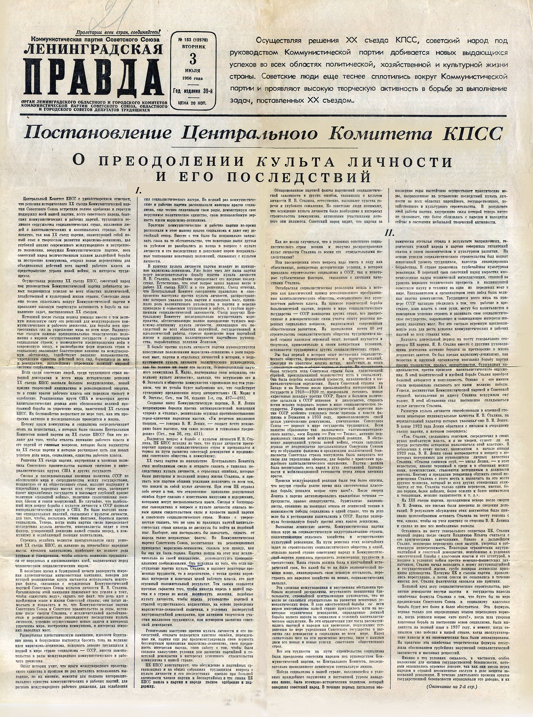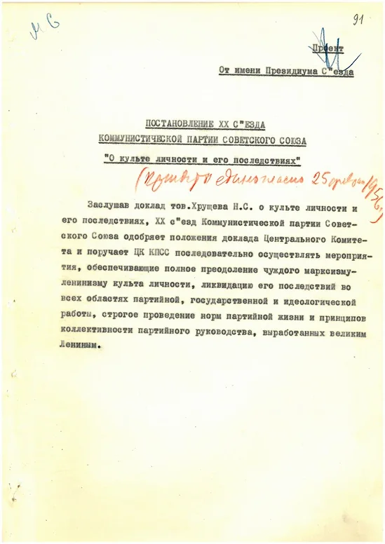 Постановление ЦК КПСС. «Смягчённый» вариант доклада был обнародован 30 июня 1956 года в виде постановления Президиума ЦК КПСС «О преодолении культа личности и его последствий» — открытого документа, напечатанного во всех центральных и региональных газетах. Постановление задавало рамки допустимой критики: Сталин, несмотря на недостатки, характеризовался как «верный сторонник Ленина и выдающийся марксист-ленинец». Культ личности, согласно документу, не увёл советское общество от построения коммунизма. Коллективизация и индустриализация объявлялись безусловными достижениями. Таким образом, постановление определило границы десталинизации: осуждение репрессий — да, пересмотр системы — нет.