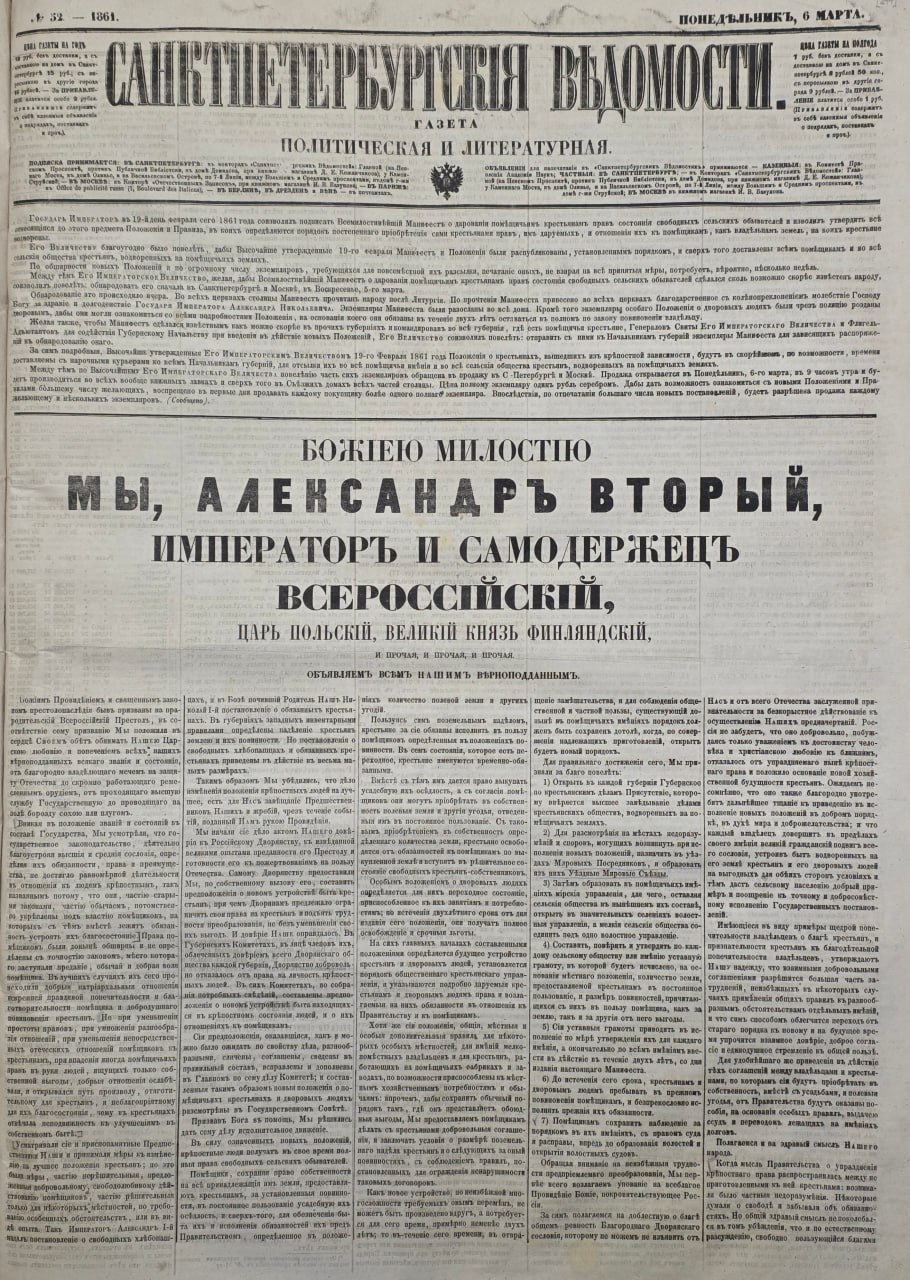 19 февраля 1861 года — в шестую годовщину восшествия Александра II на престол — Манифест был подписан. Однако опубликован он был только 5 марта (в Прощёное воскресенье), чтобы крестьяне узнали о свободе в период Великого поста, когда вероятность волнений считалась наименьшей.