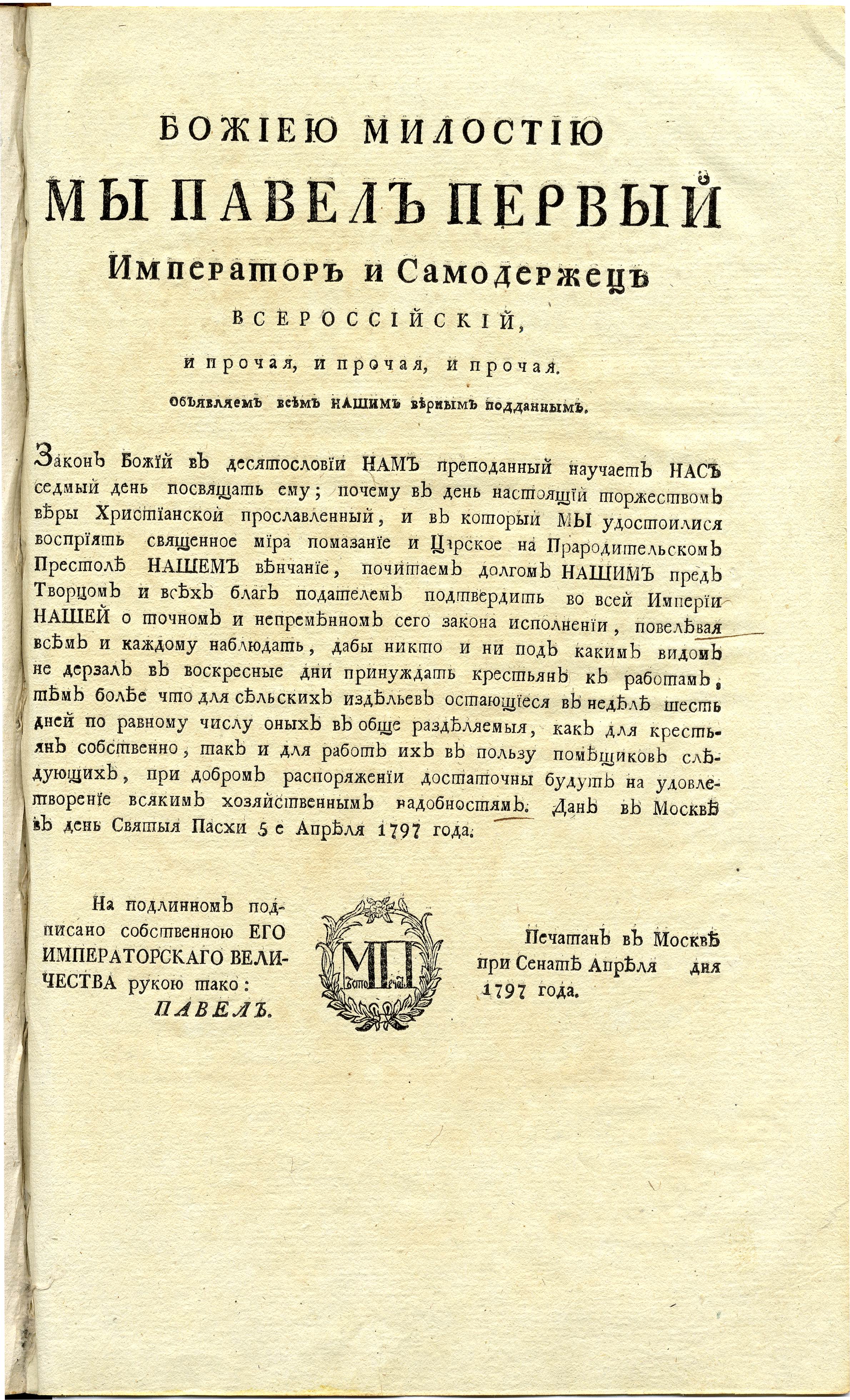 Закон Божий в десятословии Нам преподанный научает Нас седьмый день посвящать Ему; почему в день настоящий торжества веры Христианской прославленный, и в который Мы удостоились воспринять священное миро помазание и Царское на Прародительском Престоле Нашем венчание, почитаем долгом Нашим пред Творцом и всех благ подателем подтвердить во всей Империи Нашей о точном и непременном сего закона исполнении, повелевая всем и каждому наблюдать, дабы никто и ни под каким видом не дерзал в воскресные дни принуждать крестьян к работам, тем более что для сельских издельев остающиеся в неделе шесть дней по равному числу оных вообще разделяемые, как для крестьян собственно, так и для работ их в пользу помещиков следующих, при добром распоряжении достаточны будут на удовлетворение всяким хозяйственным надобностям.