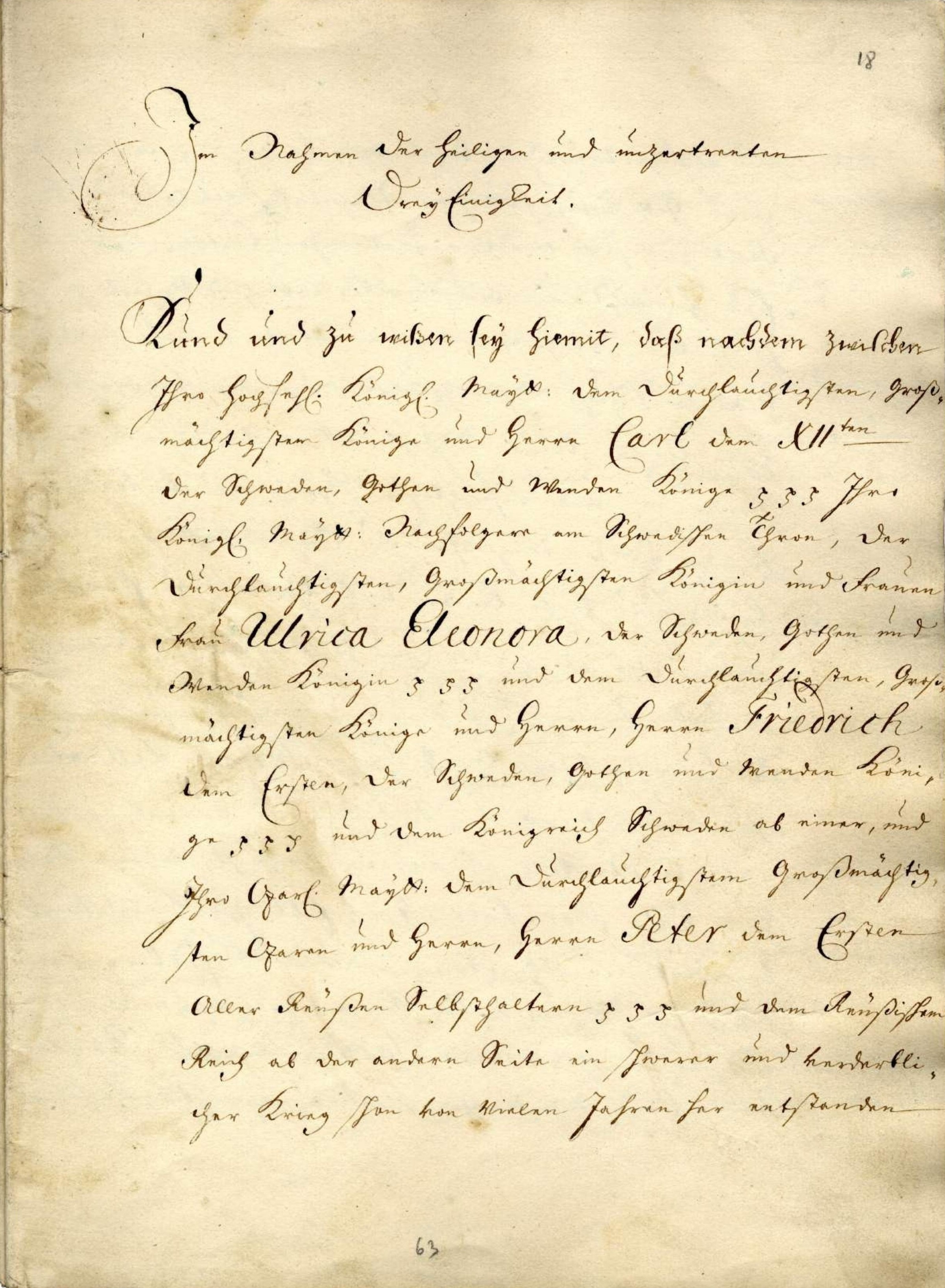 Статья 1. Имеет от ныне непрестанно пребываемой вечной, истинной и ненарушимой мир на земле и воде, такожде истинное согласие и неразрешаемое вечное обязательство дружбы быть, и пребывать между Его Королевским Величеством Свейским, Пресветлейшим, Державнейшим Королем и Государем, Государем Фридрихом первым Свейским, Готским и Венденским Королем и прочая, и прочая, и прочая, Его Королевского Величества Наследниками и Потомками Свейской короны и Королевством Свейским [...] и Его Царским Величеством Пресветлейшим, Державнейшим Царем и Государем, Государем Петром Первым, Всероссийским Самодержцем и прочая, и прочая, и прочая, Его Царского Величества Наследниками и Потомками Российского Государства [...] так, что впредь обе высокие договаривающиеся страны не токмо одна другой ничего неприятельского или противного, хотя тайно или явно прямым или посторонним образом чрез своих или иных чинить наименьше один другого неприятелем, под каким бы именем ни было, помощи не чинить, или с ними в союзы, которые сему миру противны быть могут, не вступать. Но паче верную дружбу и соседство и истинной мир между собою содержать, один другого честь, пользу и безопасность верно охранять и споспешествовать.