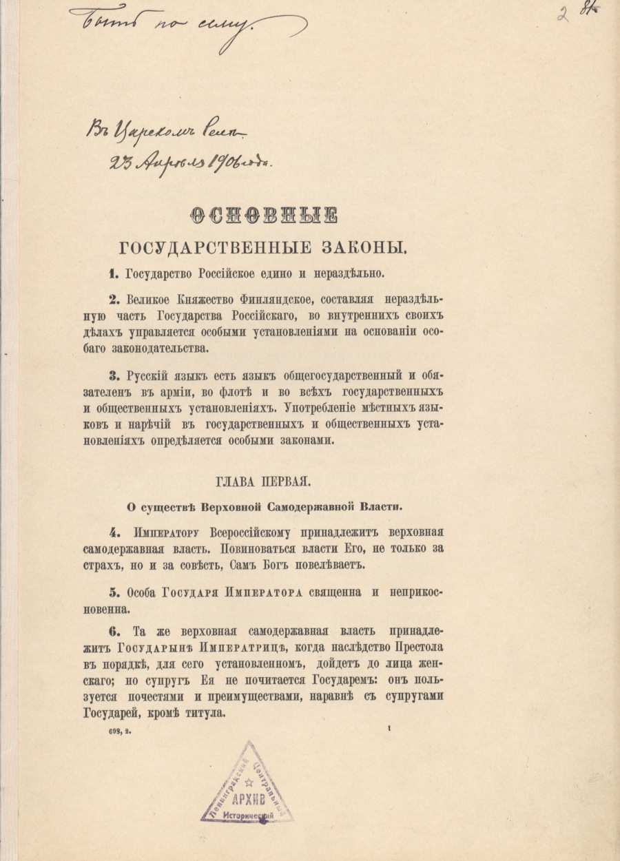23 апреля 1906 года — за четыре дня до открытия первой Государственной Думы — Основные законы были утверждены и опубликованы. Статья 8 устанавливала, что пересмотр Основных законов может происходить «единственно по почину» императора — тем самым Дума лишалась права менять конституционные основы государства.