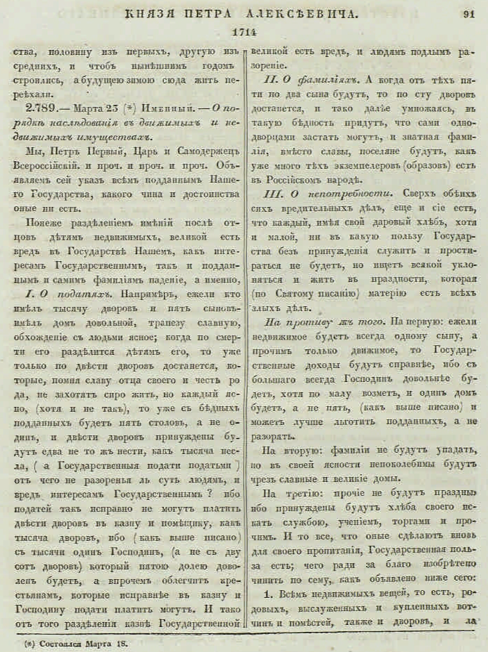 23 марта 1714 года Пётр подписал указ «О порядке наследования в движимых и недвижимых имуществах». Этот документ решал сразу две задачи: уничтожал юридическую разницу между поместьем и вотчиной (отныне всё — «недвижимое имение») и запрещал дробить землю при наследовании.